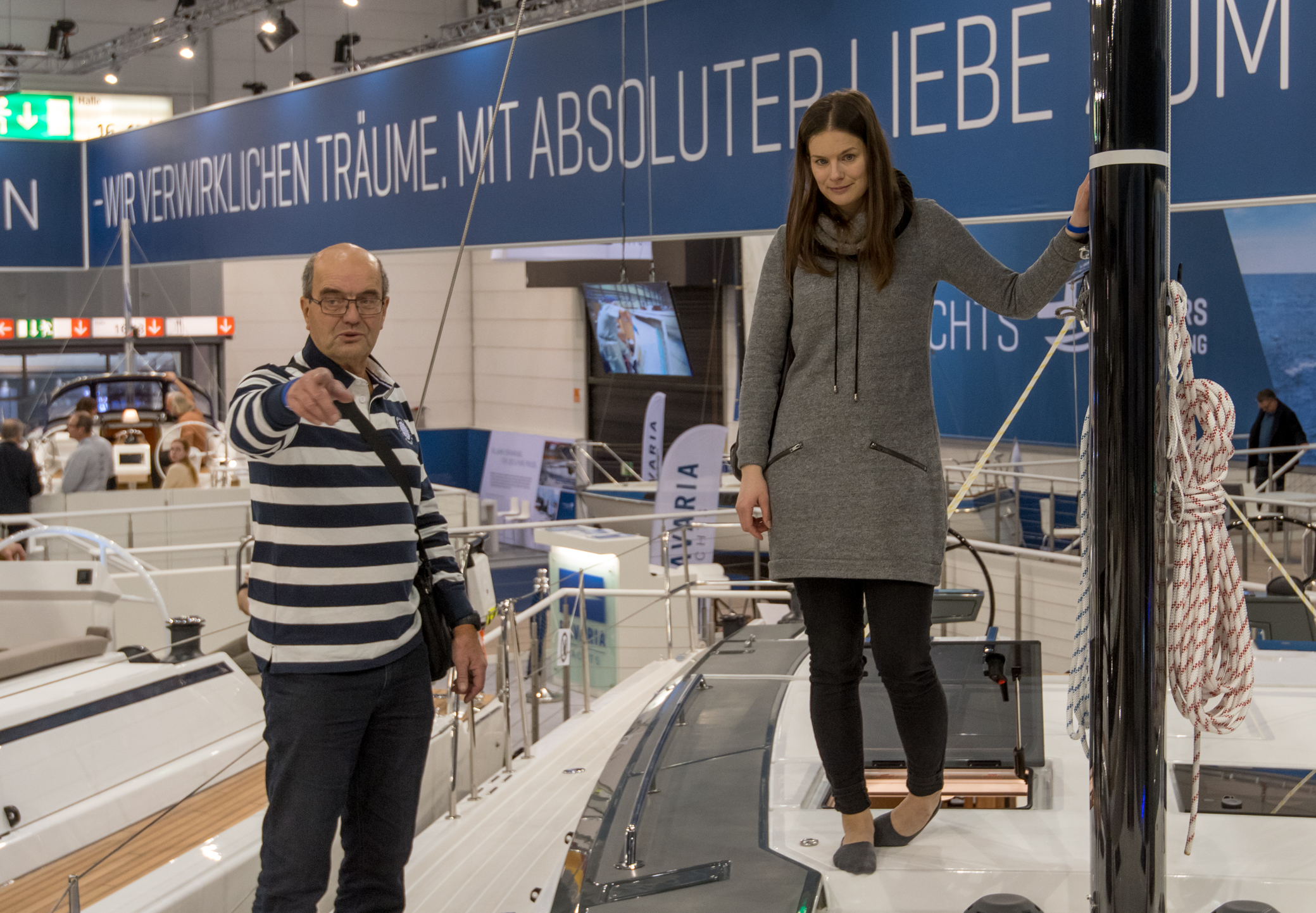 Jatkoimme Bavarioissa, joita olikin paikalla todella paljon. Kun kysyimme missä kohtaa hallia veneet löytyvät, niin meille sanottiin vain, että ette voi olla huomaamatta. Ja se oli totta, osastolla oli ainakin 10 purjevenettä. Jos unelmoidaan sellaisesta veneestä, joka olisi järkevän kokoinen ja hyvä pitkille purjehduksille, mutta toisi kaikenlaista lisäetua nykyiseen paattiin, niin päädyimme 45 jalkaiseen Bavaria Ambitioniin. Se oli pakettina juuri sopiva unelma meille ja taisimmekin ihastua siihen melko tavalla!