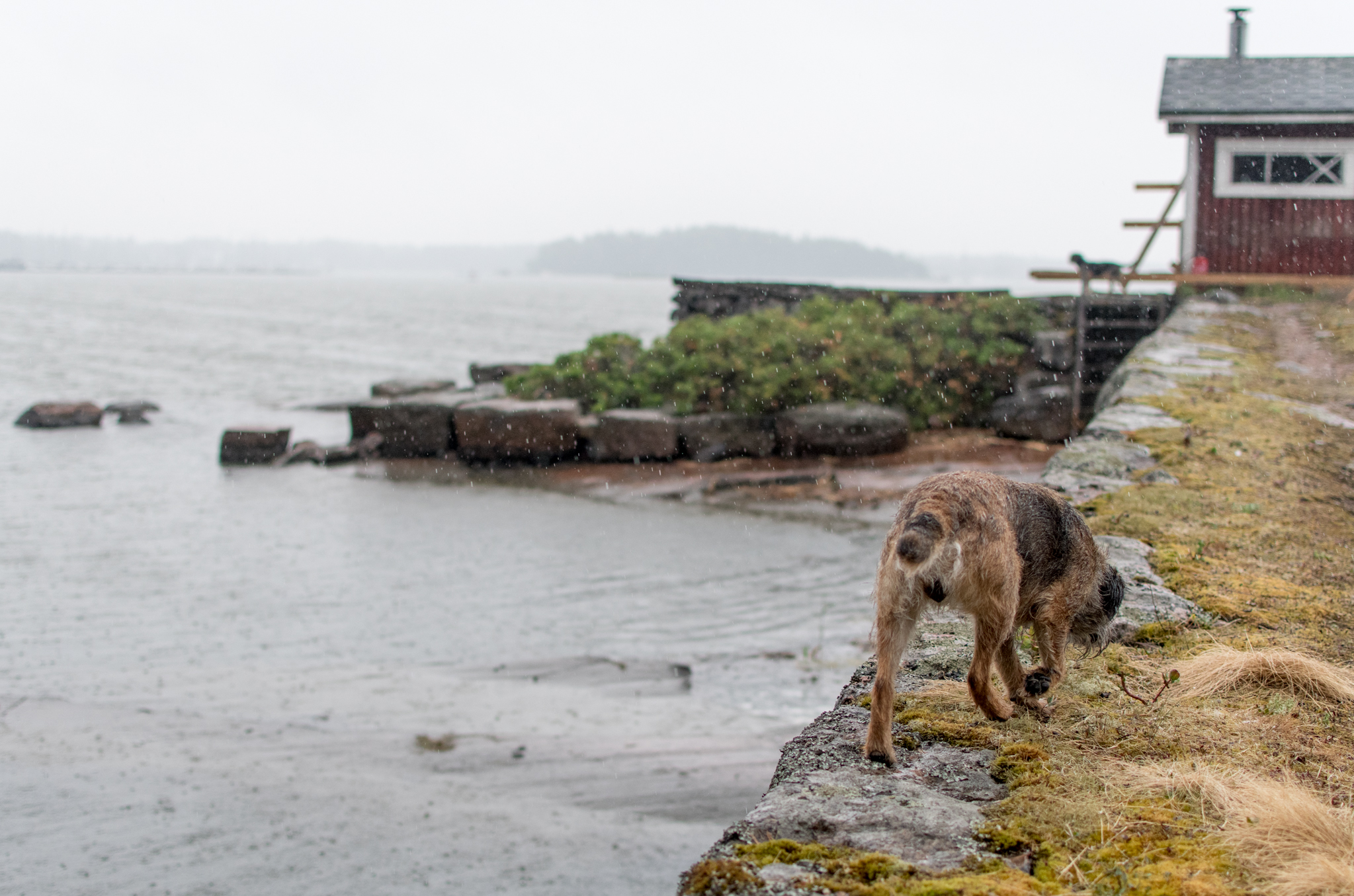 Olin tyytyväinen, vaikka aamukävelylle mennessä tajusin, että olen lähtenyt 10 päivän saarikäynnille rehvakkaasti ilman takkia. Ei vain löydy takkia koko mökistä. Joten, ainoa paksu huppari niskaan ja vesisateeseen. No pihalla huomasin, että ei nyt ihan putkeen mennyt muutenkaan. Jaakko oli jättänyt moottorisahailukamat ulos sateeseen. Siellä oli haalari, suojakengät ja hanskat. Ja kumisaappaat. Saha oli suojassa.